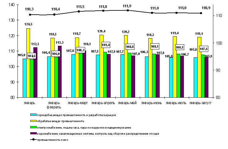 Объем промышленного производства в январе-августе 2010г. составил 7467,6 млрд. тенге в действующих ценах, что на 10,9% больше, чем в январе-августе 2009г. В горнодобывающей промышленности и разработке карьеров производство возросло на 5,8%, обрабатывающей промышленности – на 19,1%, электроснабжении, подаче газа, пара и воздушном кондиционировании – на 7,6%, водоснабжении: канализационной системе, контроле над сбором и распределением отходов – на 5,9%.