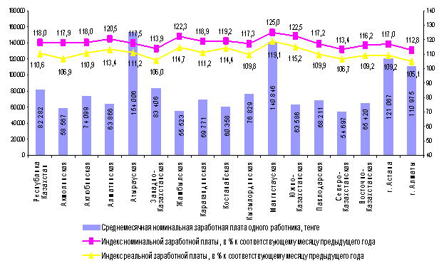 Среднемесячная номинальная заработная плата, начисленная работникам в июле 2010г. составила 82282 тенге. Прирост к июлю 2009г. составил 18%. Индекс реальной заработной платы к июлю 2009г. составил 10,6%.