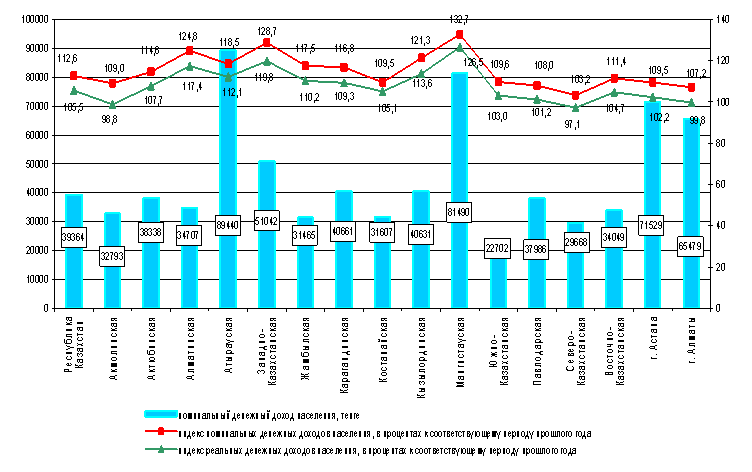 Среднедушевые номинальные денежные доходы населения в июле 2010 года, по предварительным данным, составили 39364 тенге, увеличившись по сравнению с соответствующим периодом 2009 года на 12,6%. Реальные денежные доходы выросли на 5,5%. Лидирующие позиции по размерам среднедушевых денежных доходов в июле 2010 года занимают Атырауская, Мангистауская области и город Астана, где данный показатель превысил среднереспубликанский уровень в 2,3-1,8 раза. В числе самых низкодоходных регионов в июле 2010 года отмечены Южно-Казахстанская, Северо-Казахстанская и Жамбылская области, в которых величина доходов населения составила в среднем 57,7% и 79,9% от республиканского уровня. Вместе с тем, наибольшие темпы роста реальных денежных доходов населения отмечаются в Мангистауской и Западно-Казахстанской областях. Соотношение между максимальными и минимальными величинами номинальных денежных доходов по регионам в июле 2010 года составило 3,9 раза (в июле 2009 года – 3,6 раза).