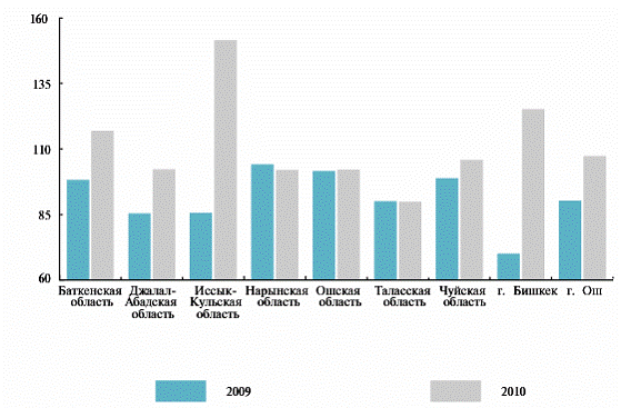 Индекс потребительских цен за январь-август 2010 года к декабрю 2009-го составил 7,2 процента. Реальный рост среднемесячной заработной платы за январь-июль 2010 года составил 9,3 процента. В номинальном выражении среднемесячная заработная плата сложилась на уровне 6 тысяч 720 сомов.[28]