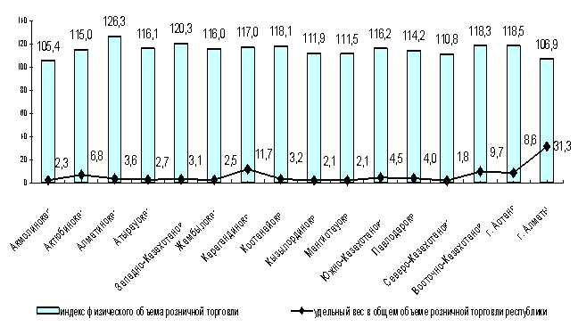 Объем розничной торговли в январе-августе 2010 года увеличился по сравнению с соответствующим периодом прошлого года на 13,2% и достиг 1840,8 млрд. тенге. В августе текущего года объем розничной реализации товаров увеличился на 13,2% по сравнению с августом 2009 года и на 3,6% по сравнению с предыдущим месяцем 2010 года.