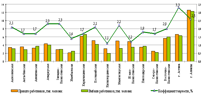 В августе месяце т.г. коэффициент оборота по приему составил 2,5%, оборота по увольнению – 2,3%, текучести кадров – 2,0%. Из числа работников, уволенных в августе т.г., 108,0% замещены вновь принятыми кадрами.