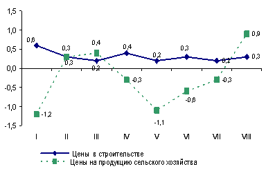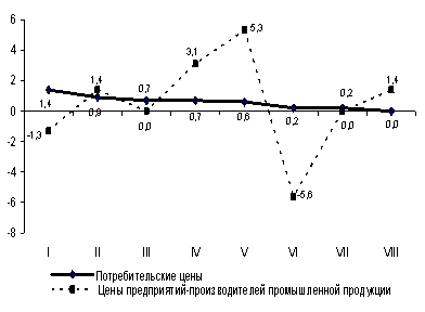 Индекс потребительских цен в августе т.г. составил 100%. Цены в промышленности за месяц выросли на 1,4%, оптовой торговле – на 1,2%, сельском хозяйстве – на 0,9%, лесном – на 0,5%, строительстве – на 0,3%. Тарифы на услуги связи для юридических лиц снизились на 0,3%.