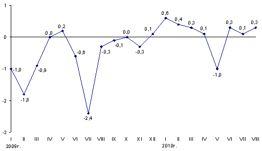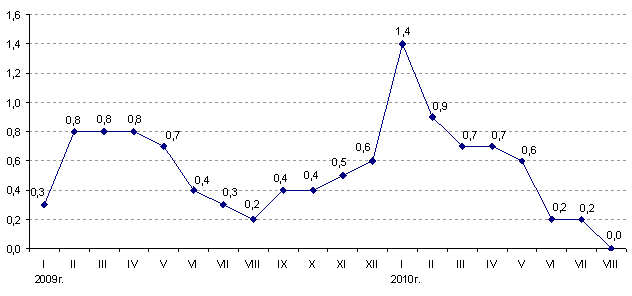 Индекс потребительских цен в августе 2010г. по сравнению с декабрем 2009г. составил 104,6%. Цены на продовольственные товары возросли на 5,5%, непродовольственные – на 3,4%, платные услуги – на 4,7%. Цены предприятий-производителей промышленной продукции в августе 2010г. по сравнению с декабрем 2009г. повысились на 3,9%.
