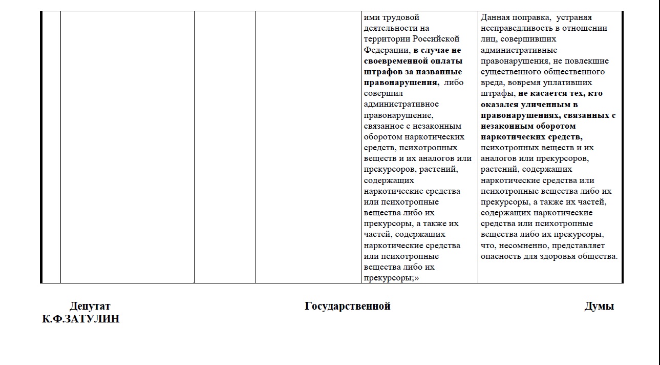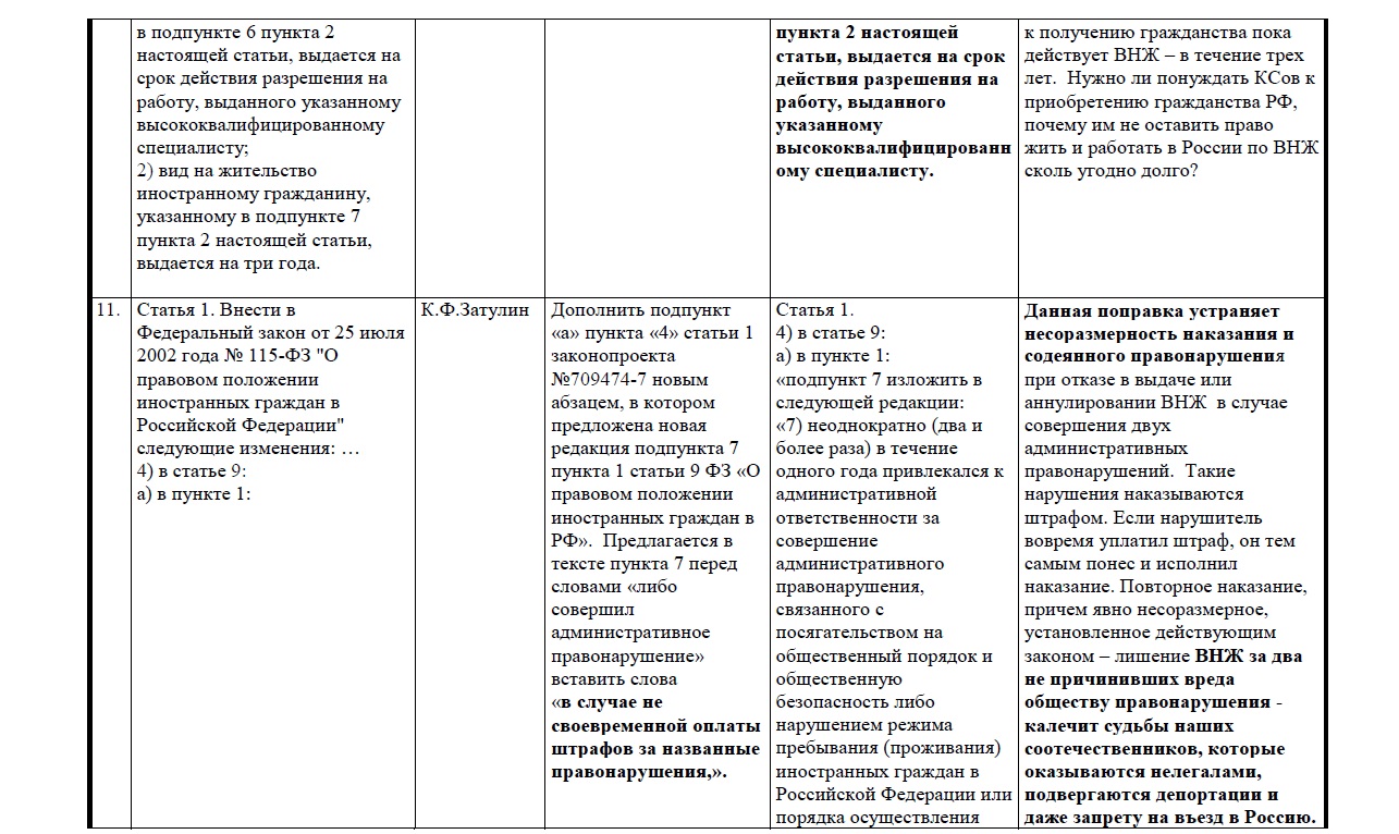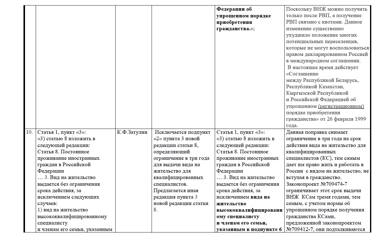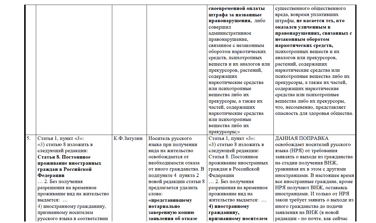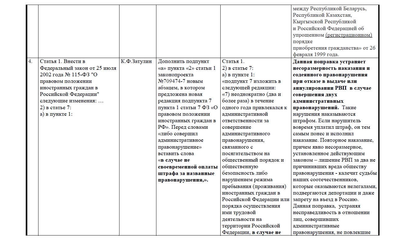 Прилагаем таблицу поправок, направленных Затулиным в профильный комитет.
