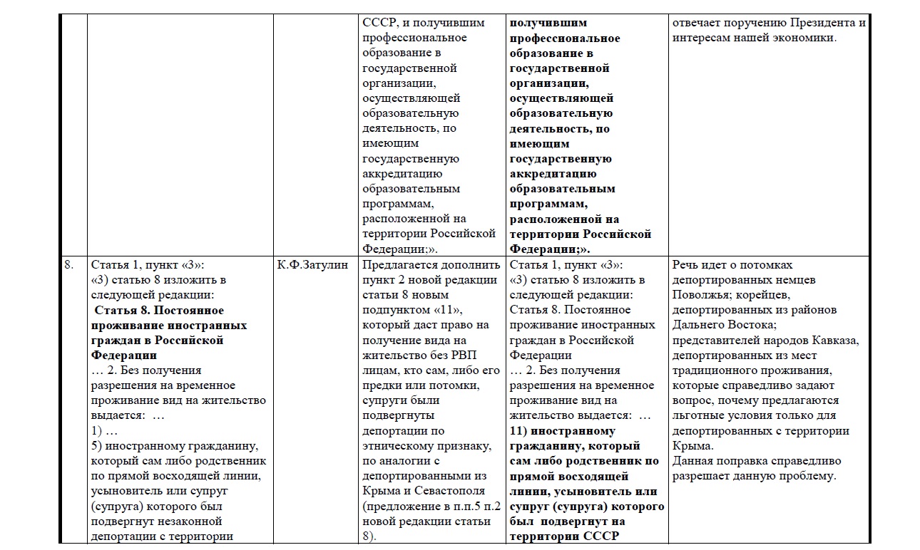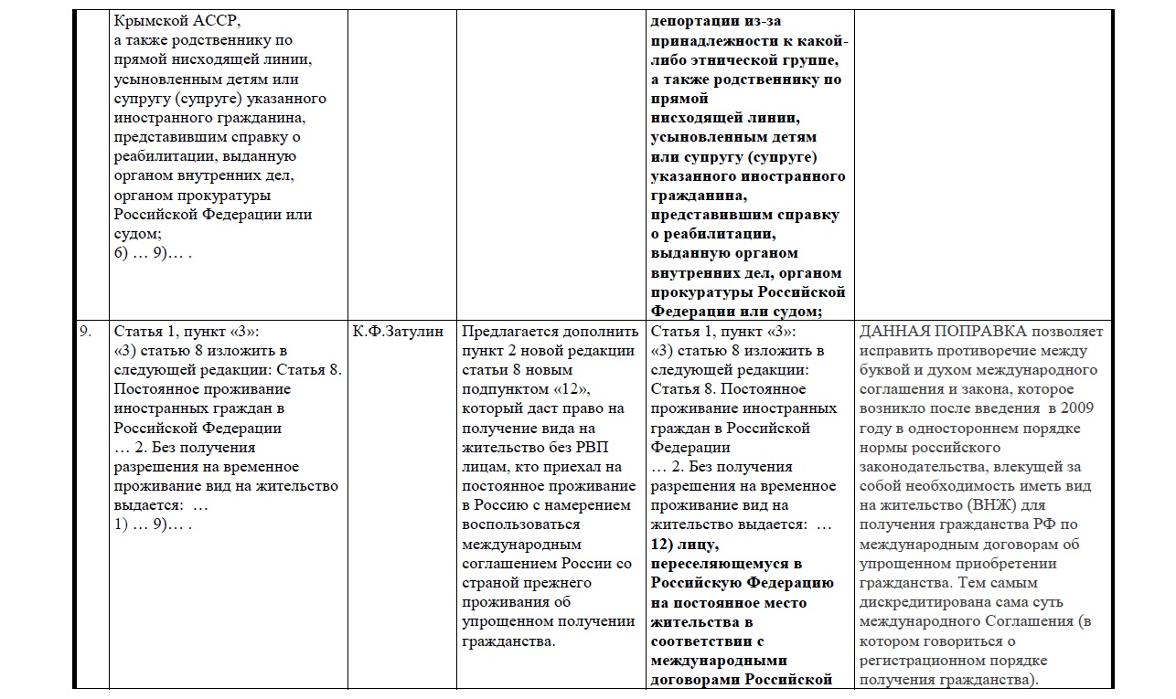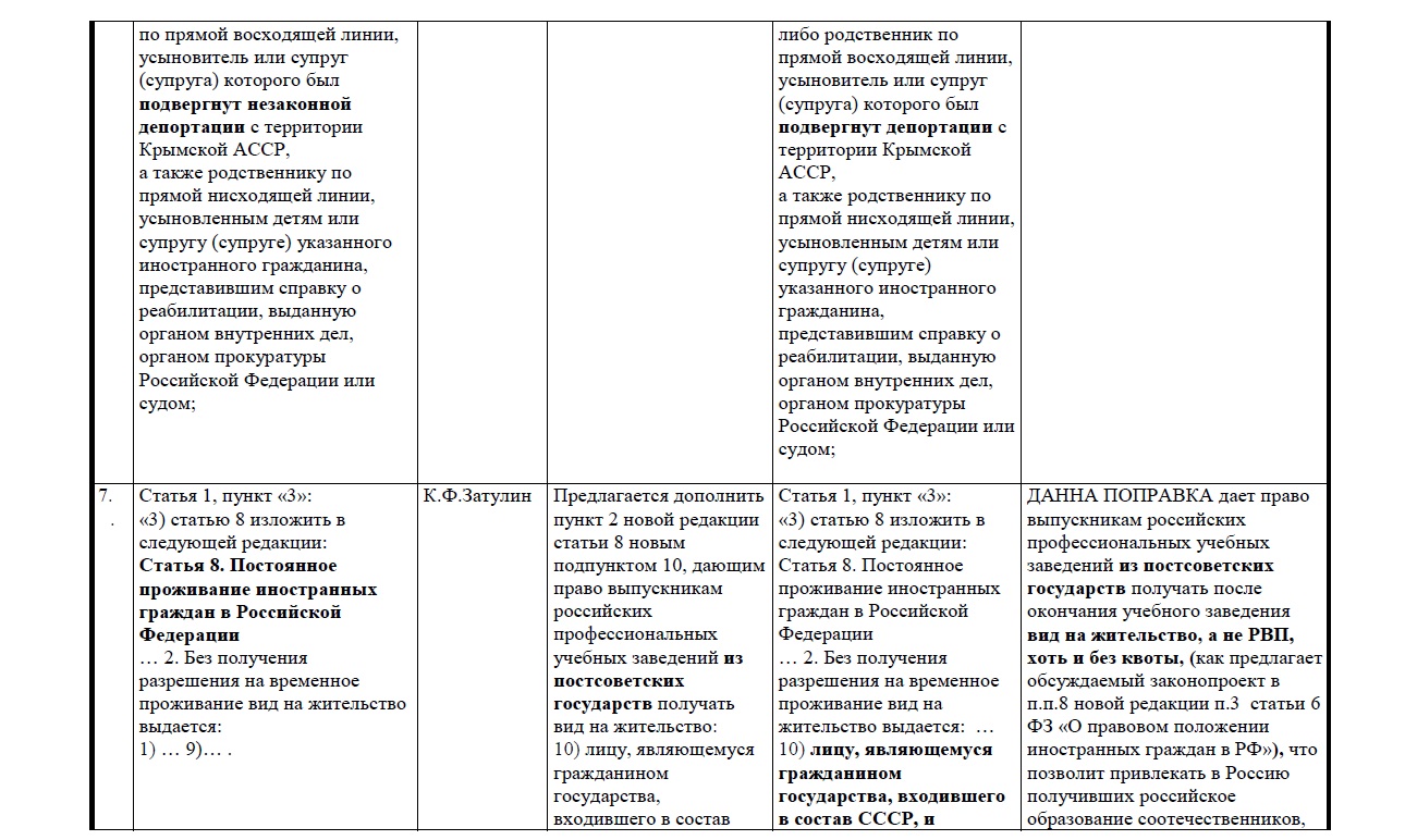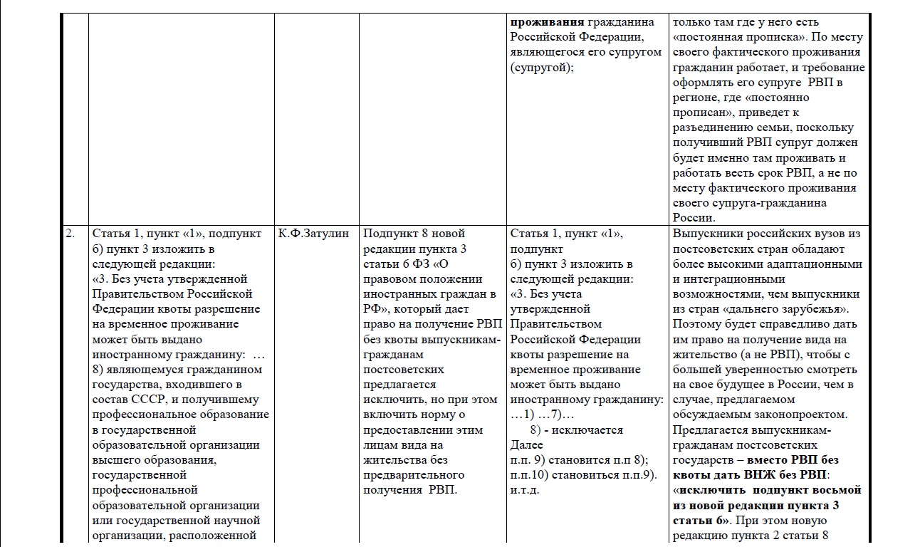 Депутатом К. Затулиным внесены поправки, которые предлагают расширить возможности для наших соотечественников для получения разрешения на временное проживание без квоты и получение вида на жительство без РВП. В частности, он предлагает выпускникам российских вузов из постсоветских государств дать право на получение вида на жительство сразу после окончания, а не РВП, как в правительственном законопроекте.
