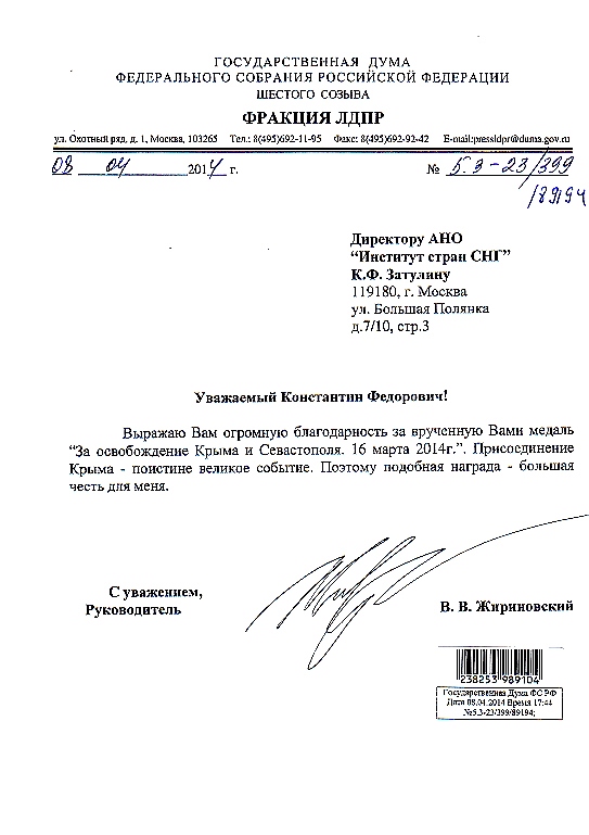 Одним из награжденных стал и депутат Государственной Думы РФ, лидер фракции ЛДПР Владимир Вольфович Жириновский, ответивший благодарственным письмом: