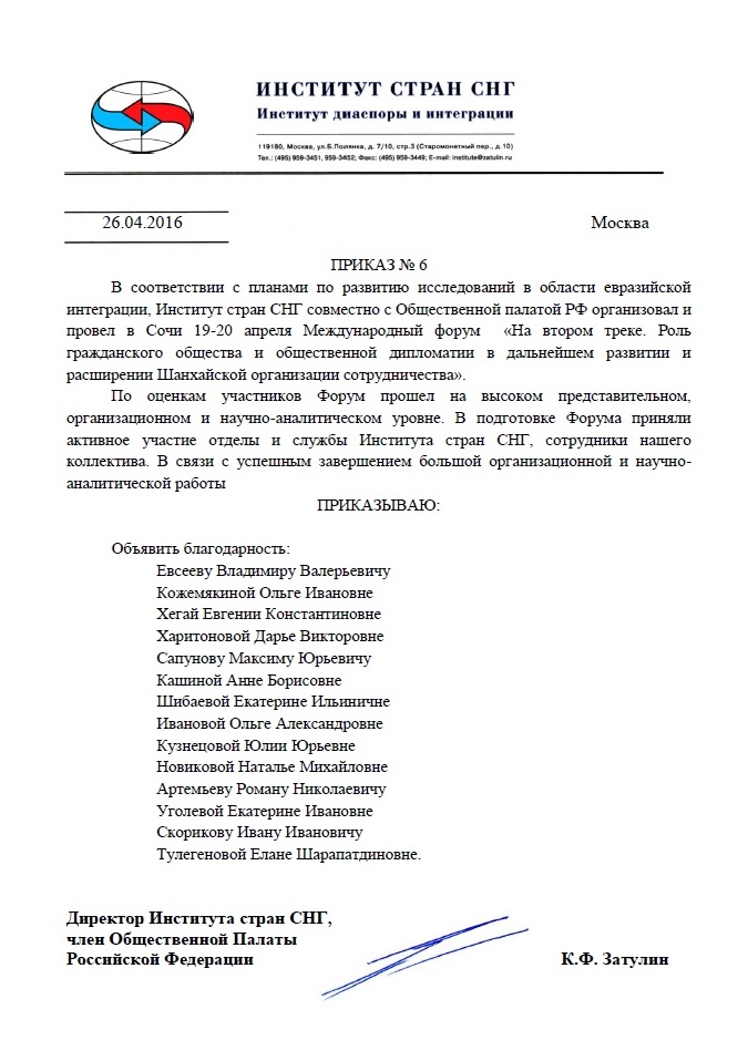 Директор Института стран СНГ выразил благодарность сотрудникам за организацию Сочинского форума