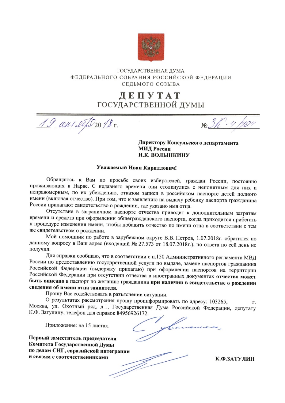 К первому заместителю председателя Государственной Думы РФ по делами СНГ, евразийской интеграции и связям с соотечественниками, депутату от Сочинского округа, куда входят граждане России, проживающие в Эстонии, Константину Затулину обратились его избиратели из Нарвы – граждане России, – в связи с тем, что при оформлении паспортов их детям в Российском Консульстве в документ не вписывают отчество, в то время как в прилагаемом свидетельстве о рождении имя отца указано. Данное обстоятельство создает трудности для российских граждан, получающих заграничные паспорта или меняющих общегражданские.