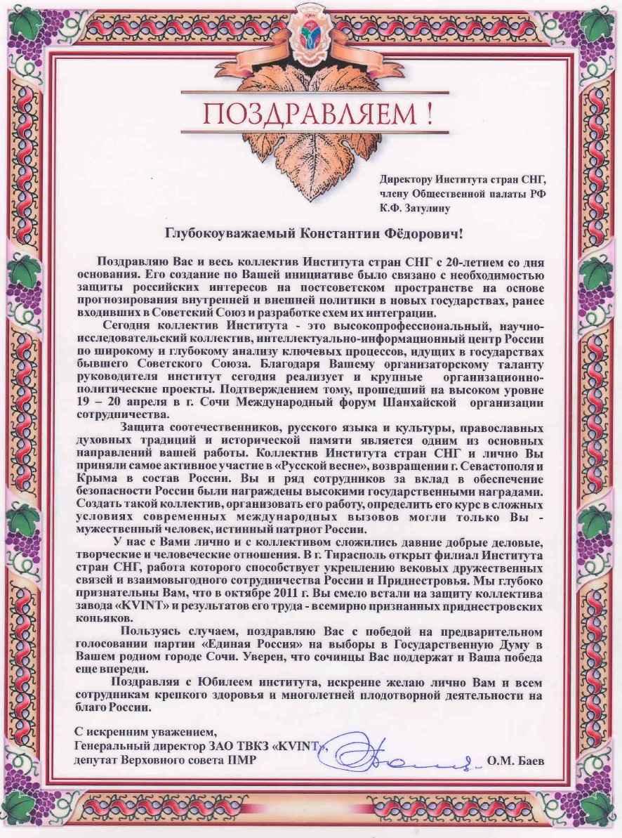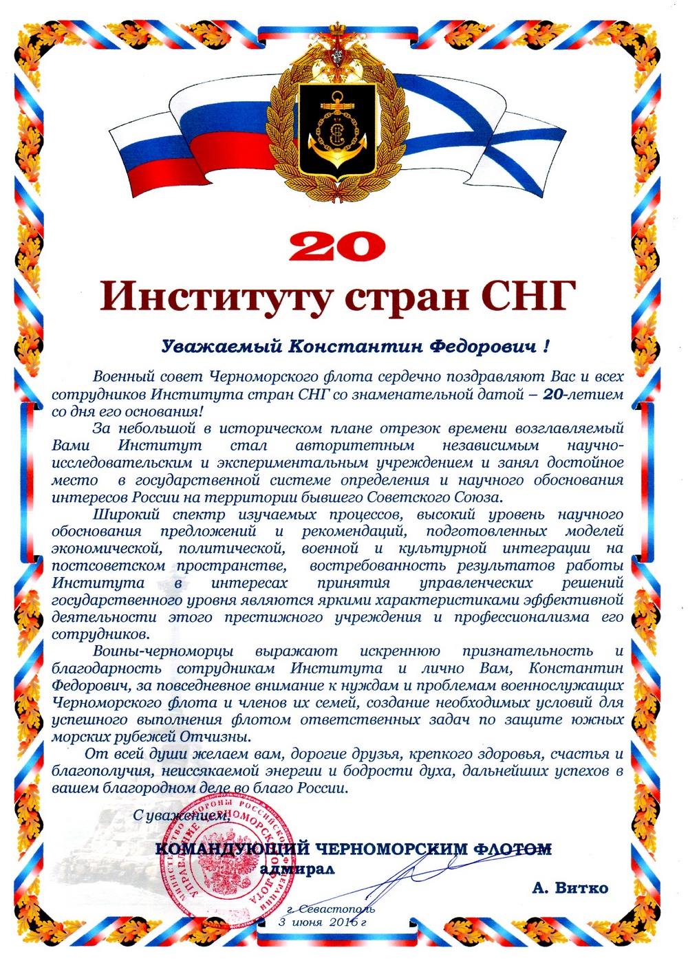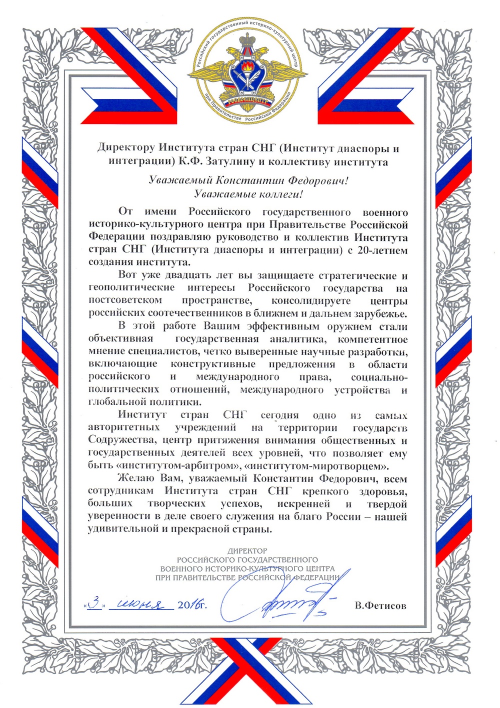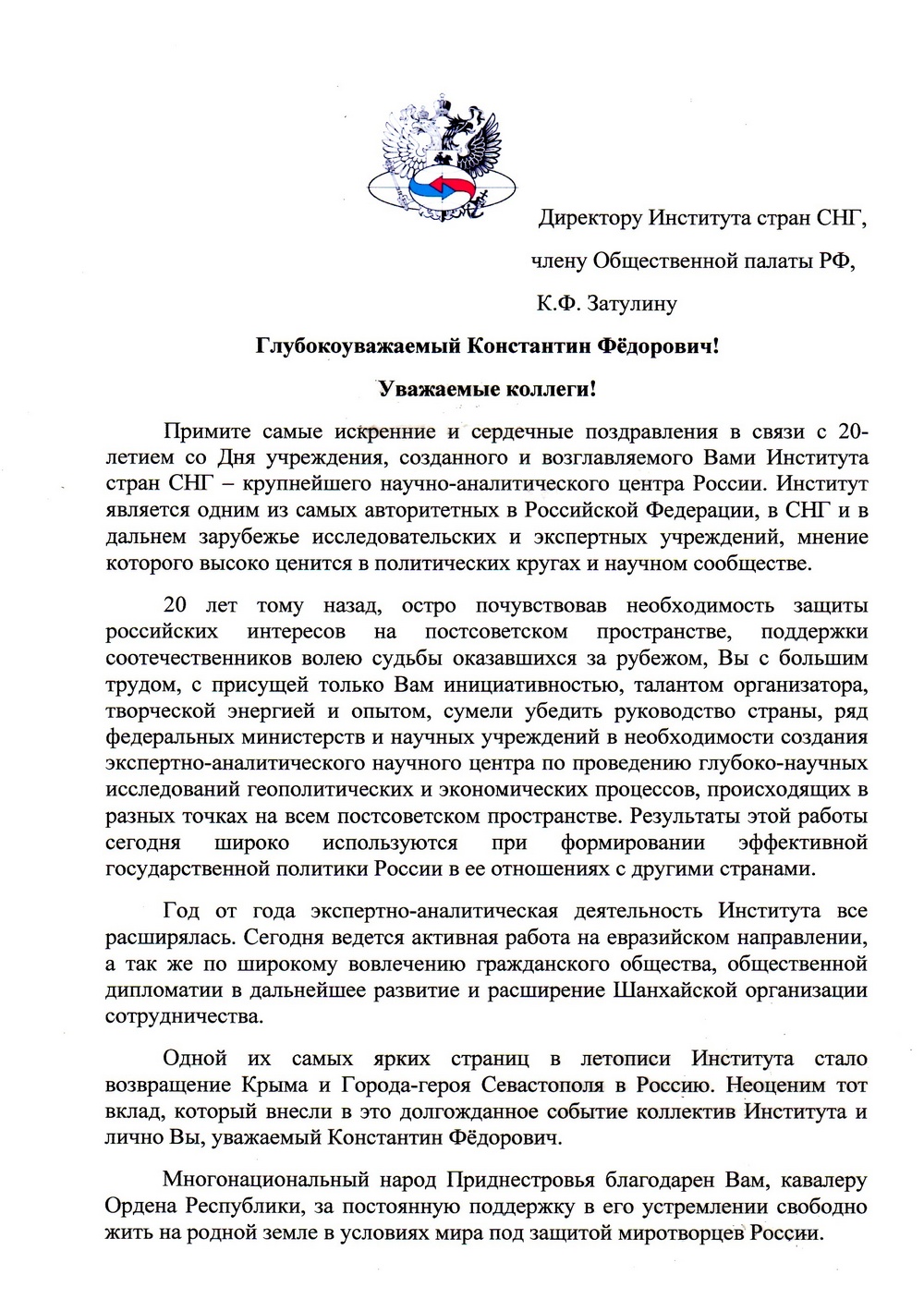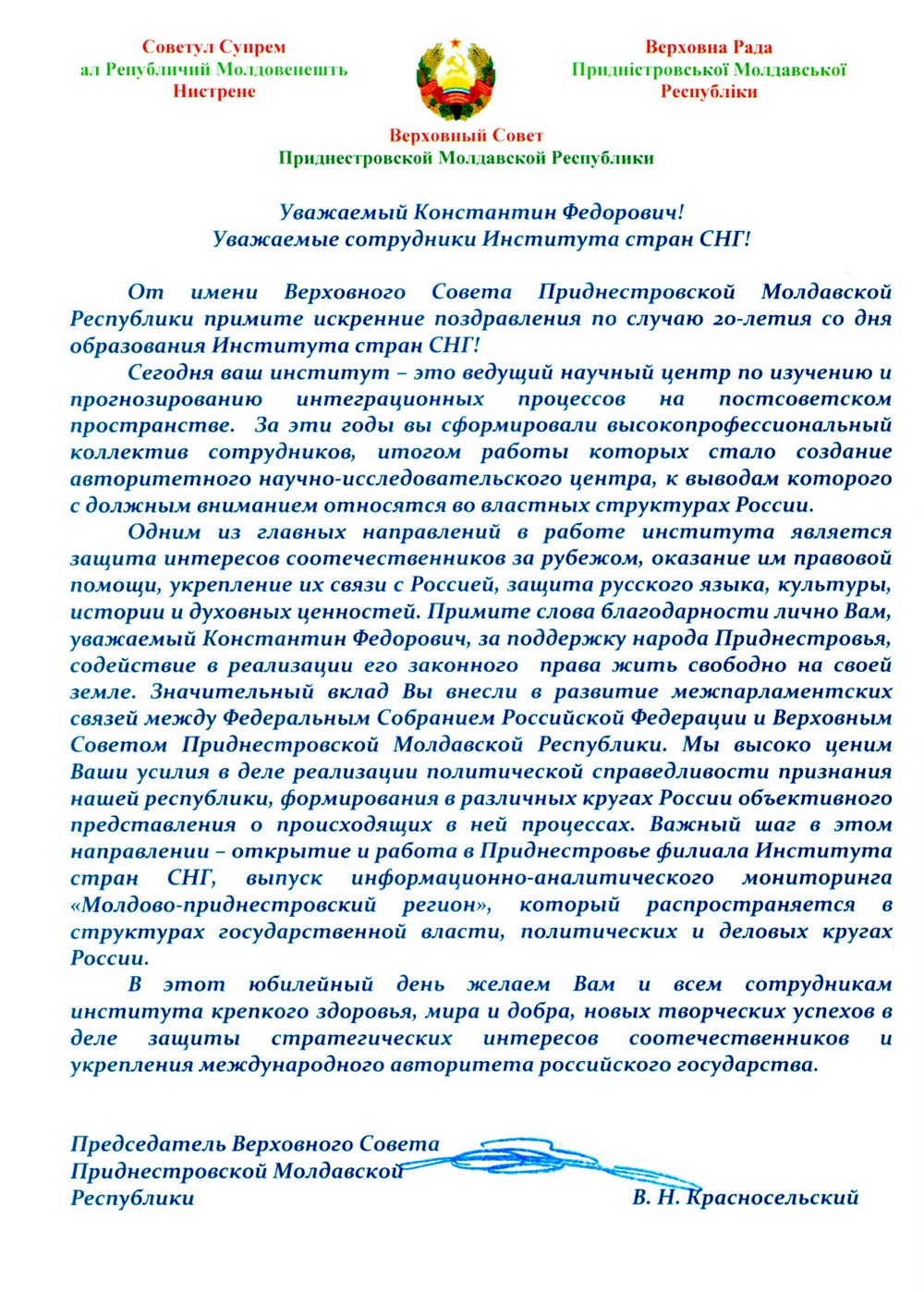 Институт стран СНГ принимает поздравления в связи с 20-летием со дня образования