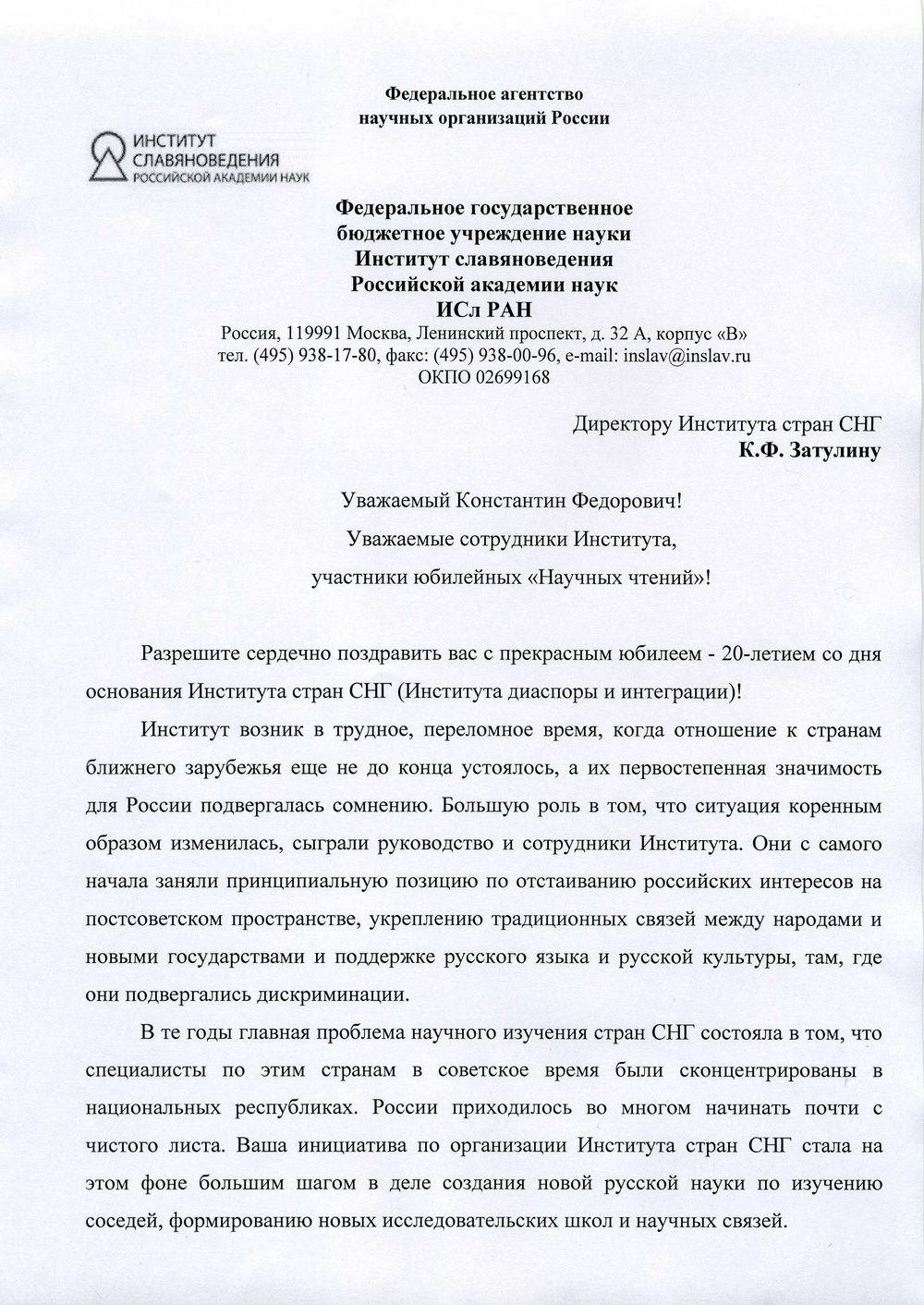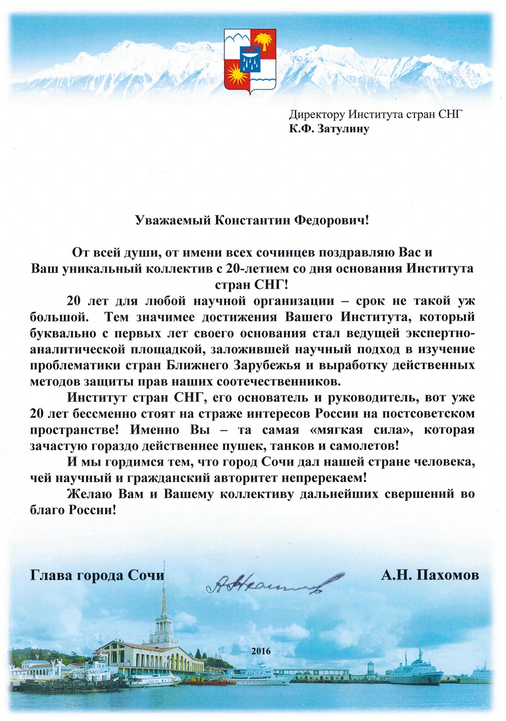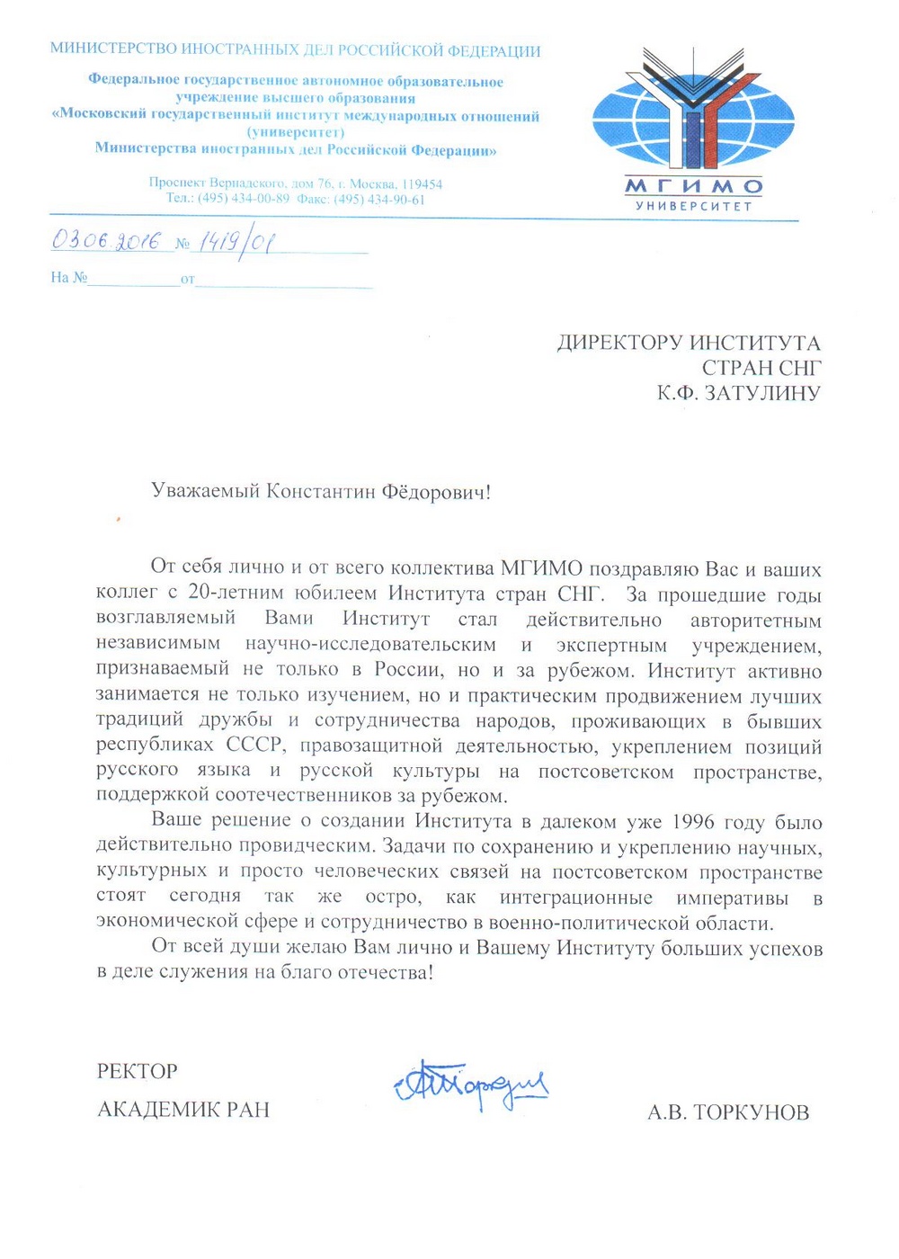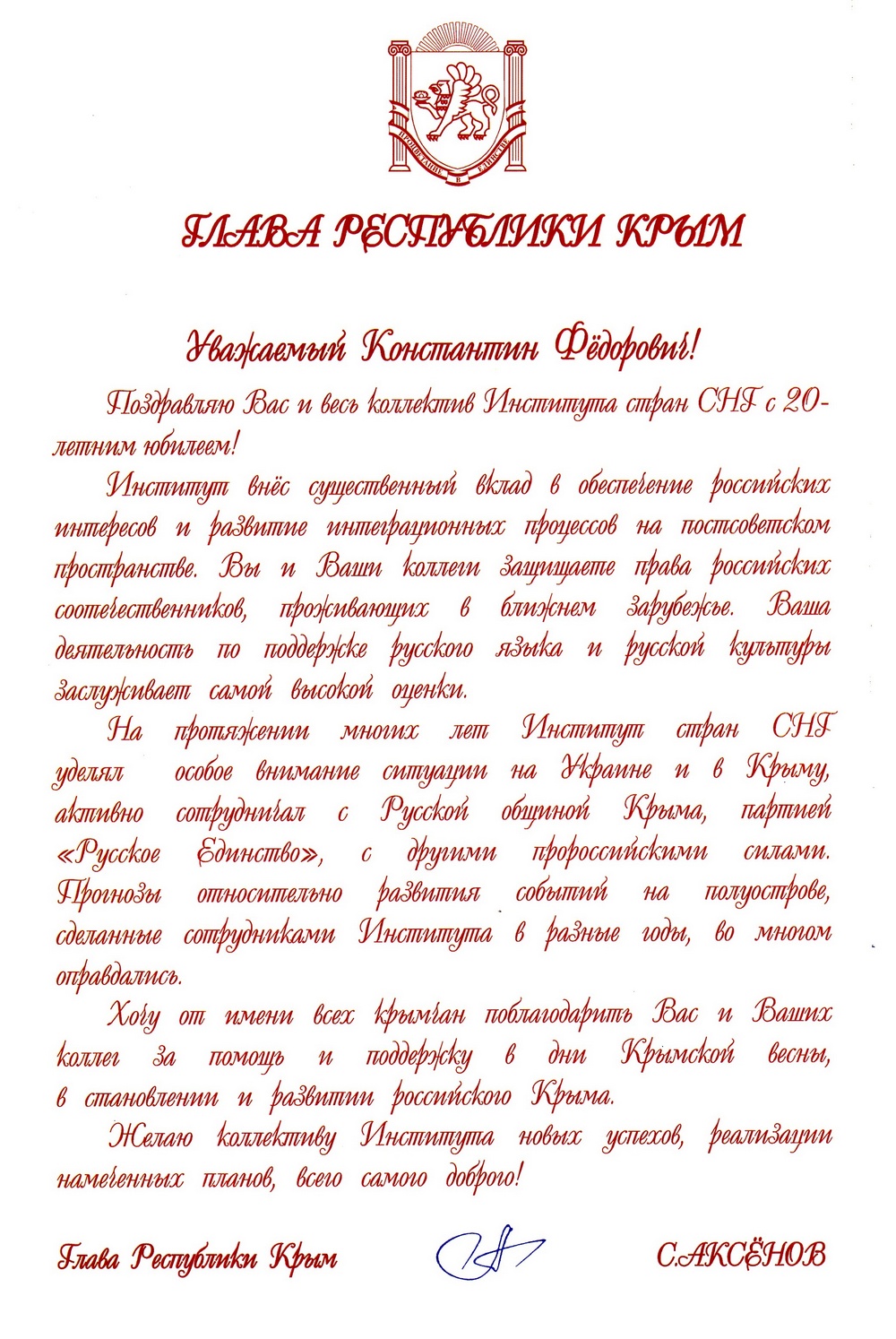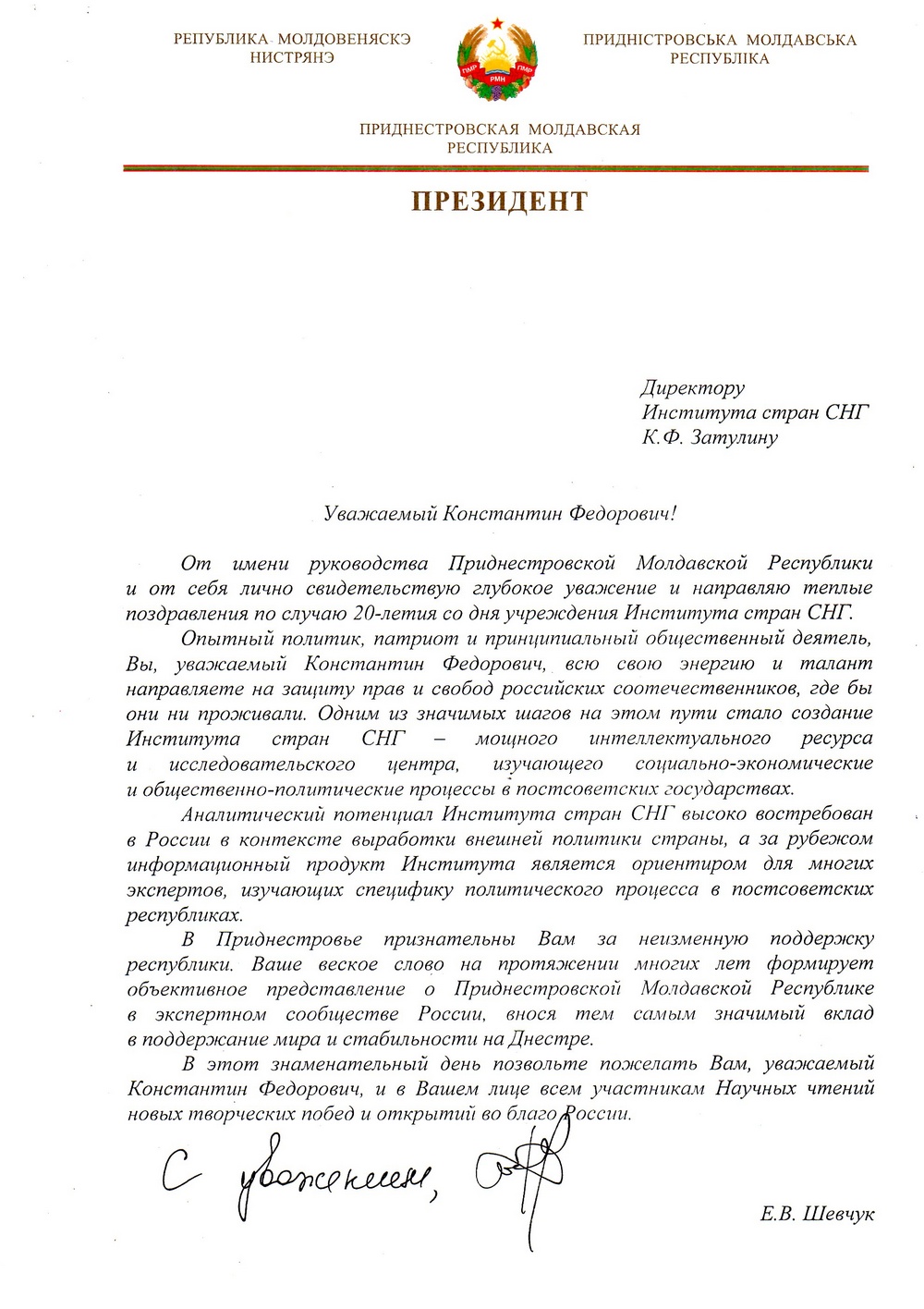 Институт стран СНГ принимает поздравления в связи с 20-летием со дня образования