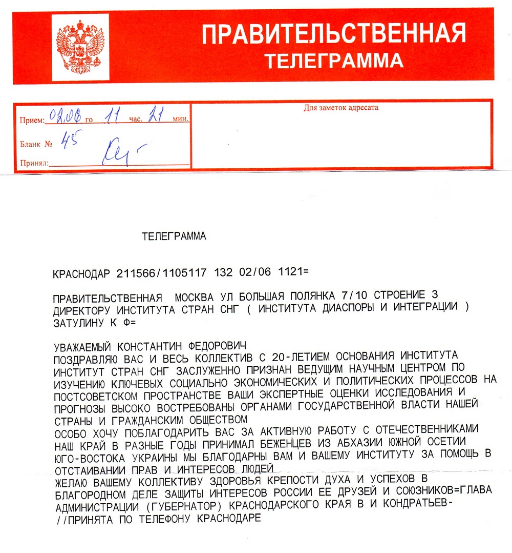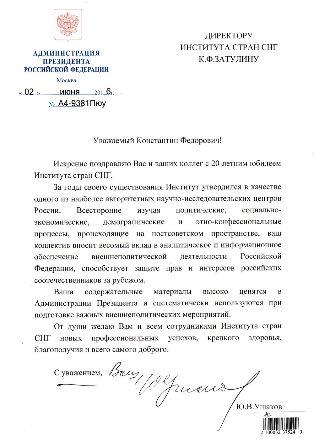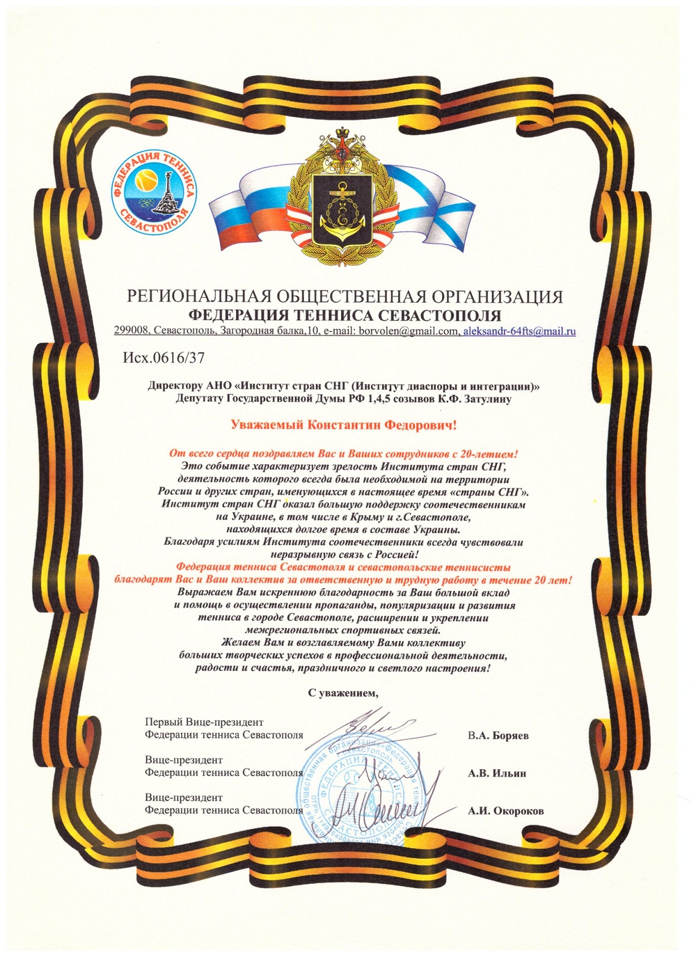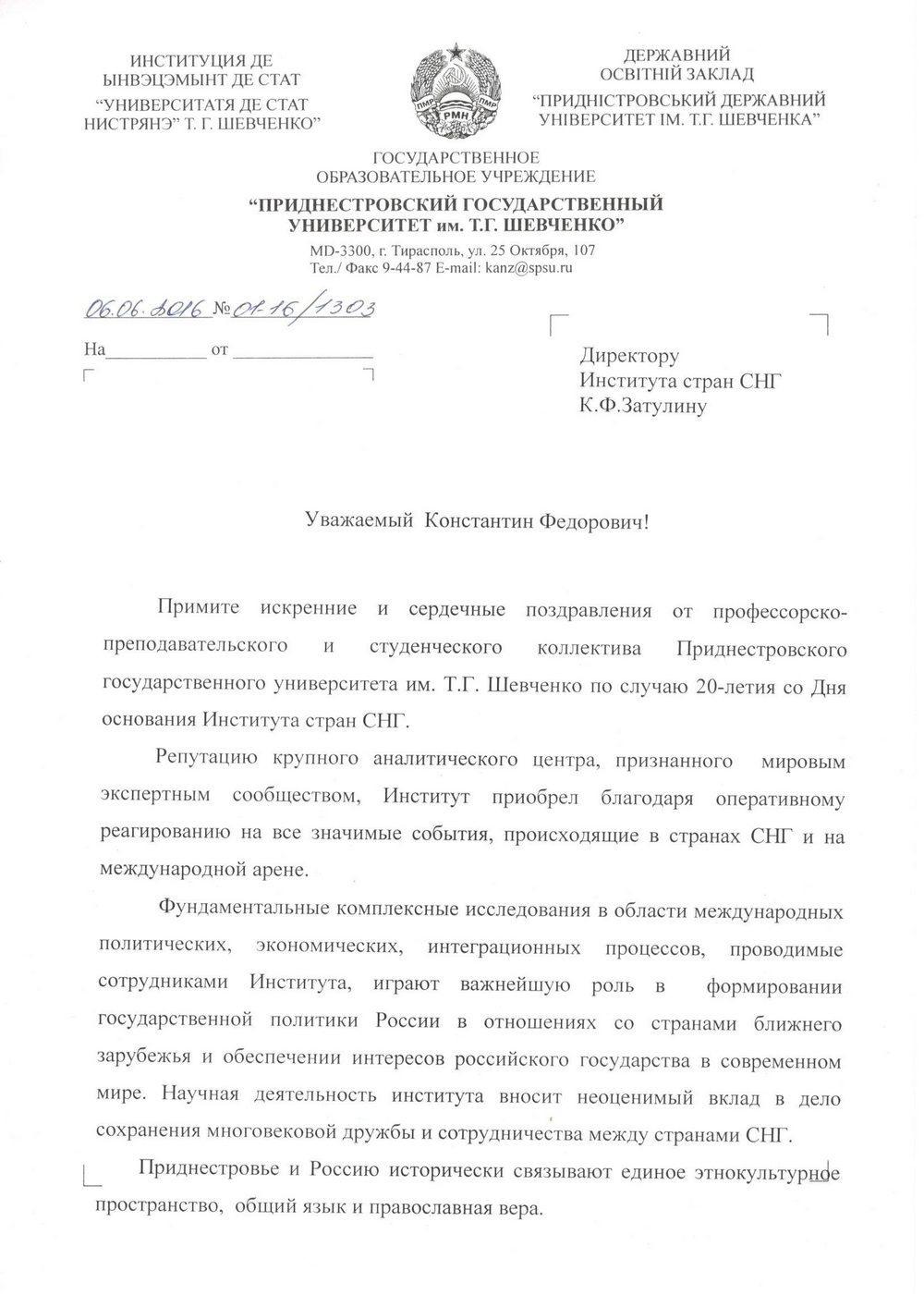 Институт стран СНГ принимает поздравления в связи с 20-летием со дня образования