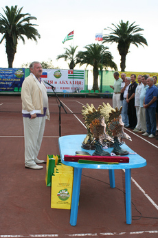 «Дорогие друзья! Приветствую участников XI Международного турнира «Большая Абхазская Шляпа – 2012». В 2001 году, когда состоялся первый турнир, Абхазия была еще непризнанной республикой, с очень большим числом нерешенных проблем, но у нас были и есть друзья, которые поддерживали Страну души в непростые времена и верили в ее будущее. Сегодня данный турнир уже традиция, которая превратилась в праздник для любителей большого тенниса.