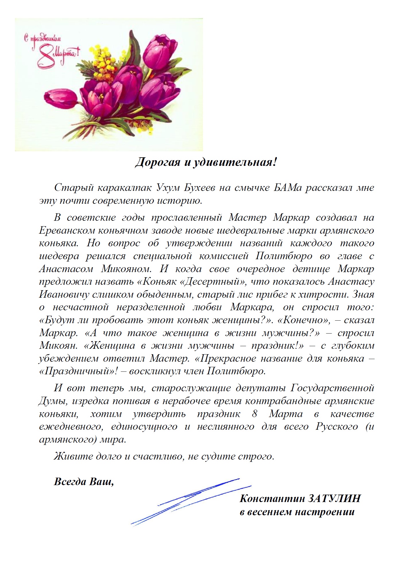 Депутат от Сочинского округа с удовольствием поздравил всех женщин с наступающим Днем 8 Марта. Сам он проведет этот день в Санкт-Петербурге, где будет участвовать в ежегодном весеннем теннисном турнире, проводимом Санкт-Петербургским университетом профсоюзов среди смешанных пар. В конце недели К. Затулин вернется в Сочи для дальнейшей работы и участия в голосовании на выборах Президента Российской Федерации 18 марта с.г.