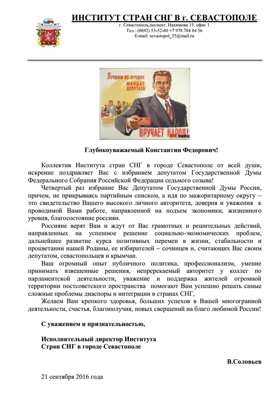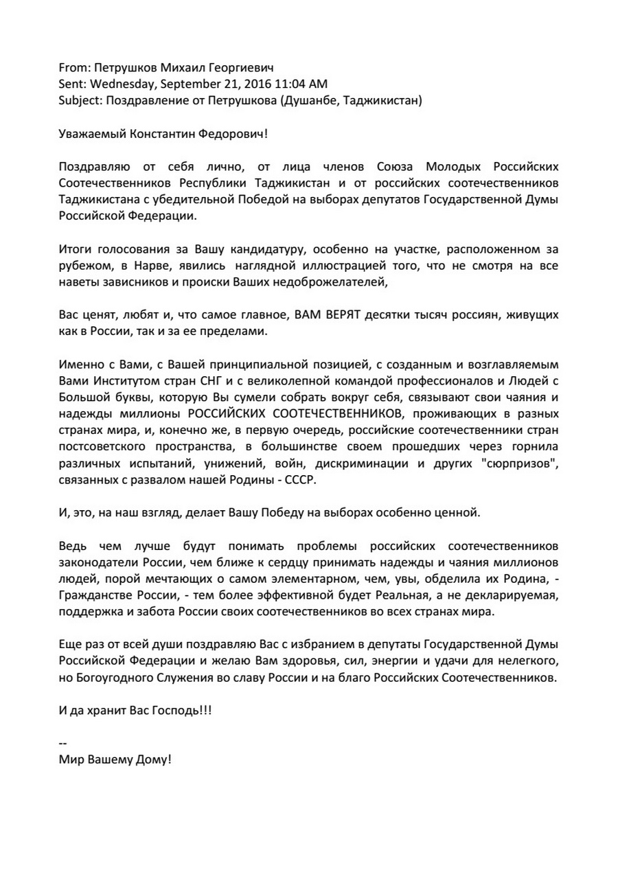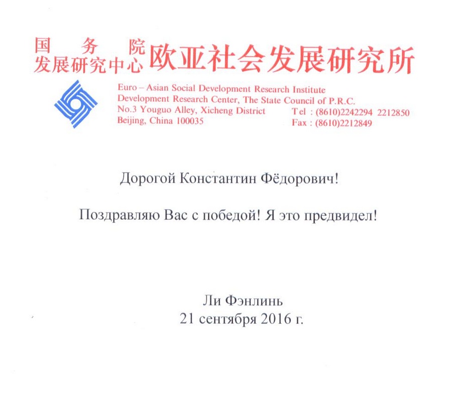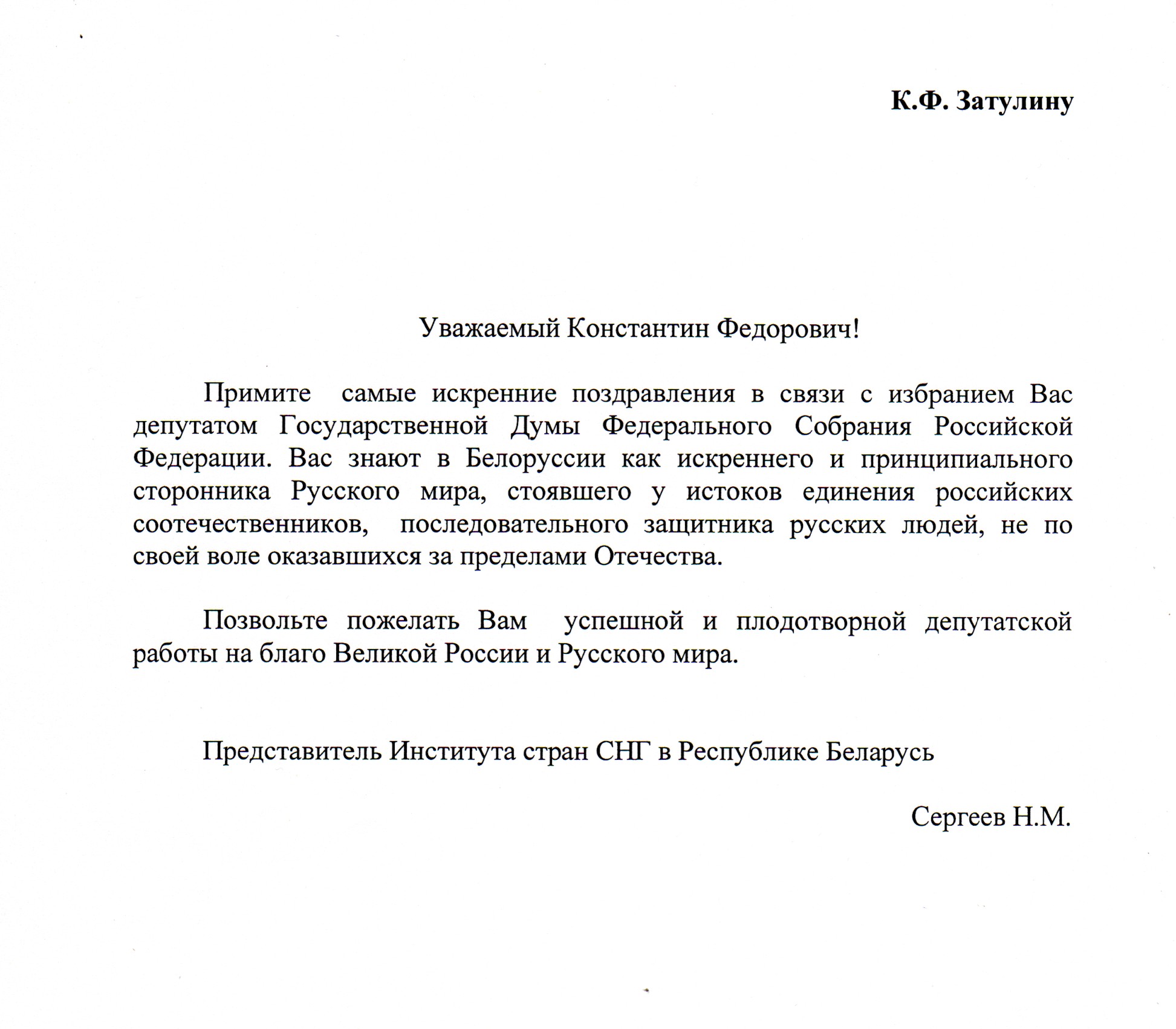 Константину Затулину поступают поздравления с победой на выборах в Государственную Думу