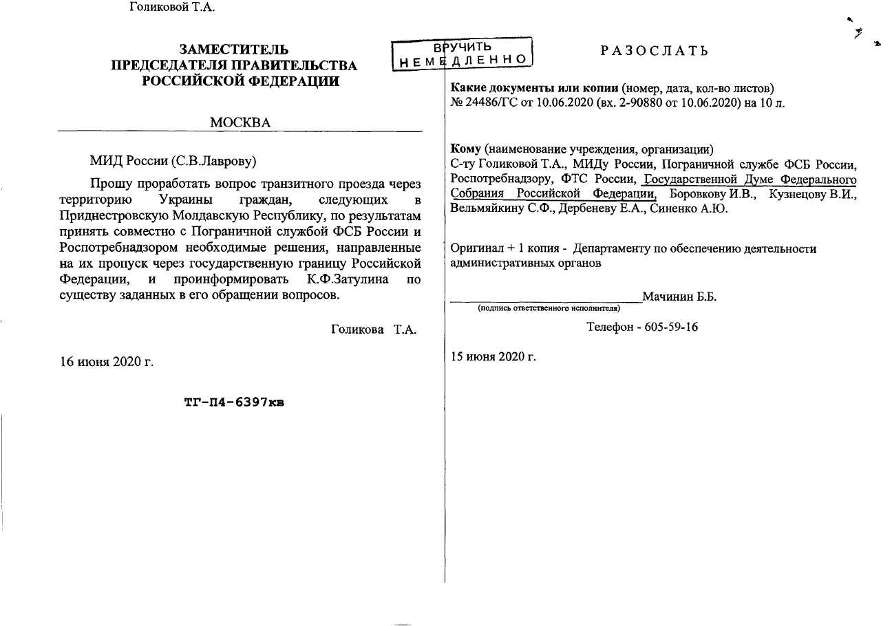 Как следует из поступившего в Госдуму ответа, для разрешения проблемы не доехавших до дома соотечественников сейчас задействованы все силы государства: МИД России, Пограничная служба ФСБ России и Роспотребнадзор. Можно надеяться, что транзитный проезд россиян через территорию Украины в Приднестровскую Молдавскую Республику в скором времени будет обеспечен.