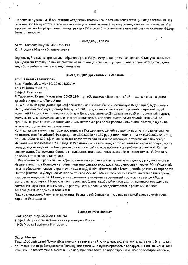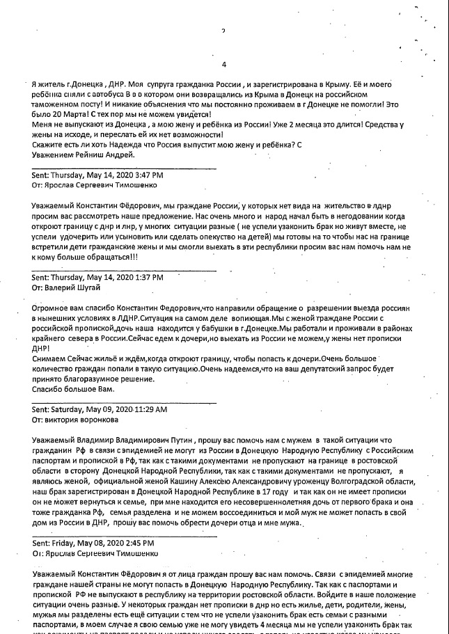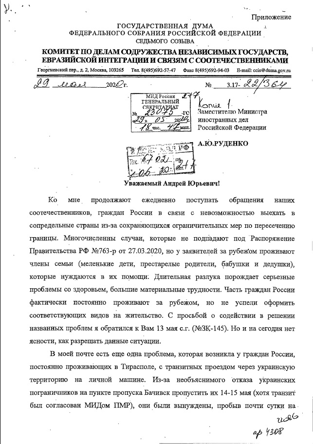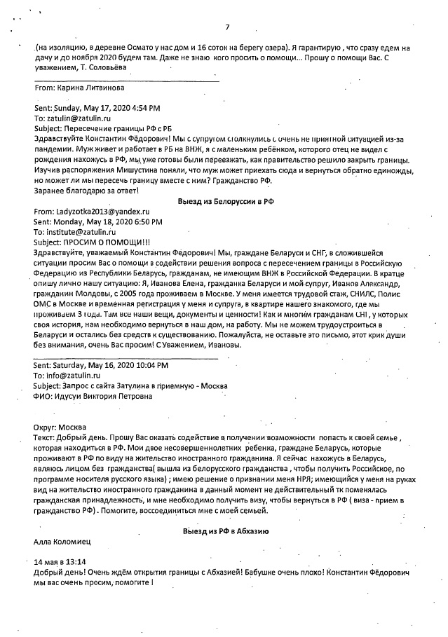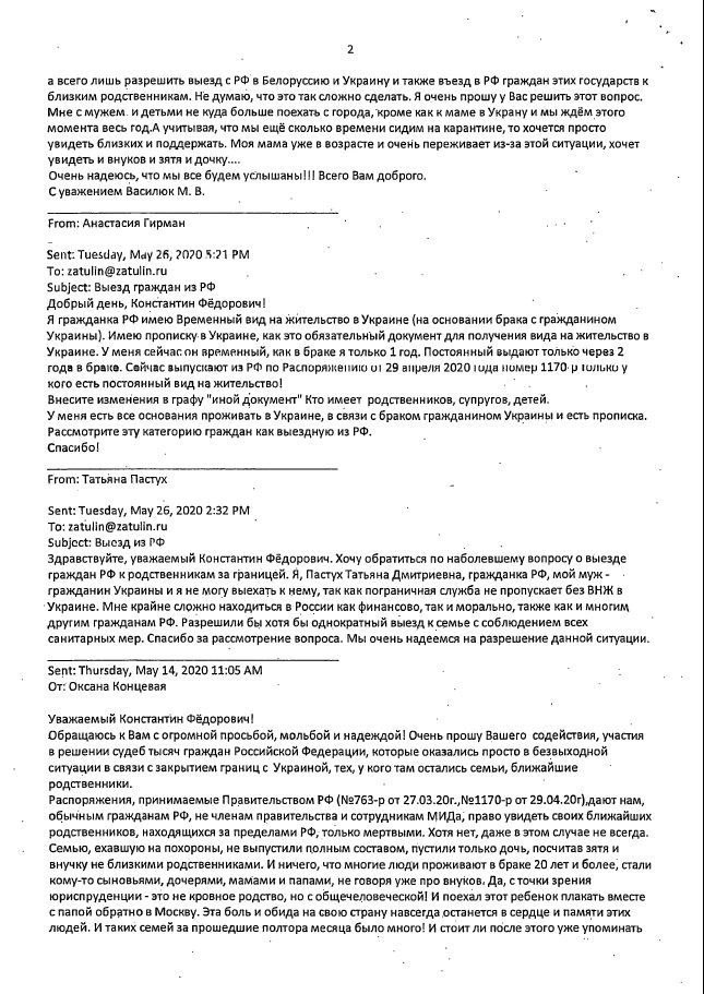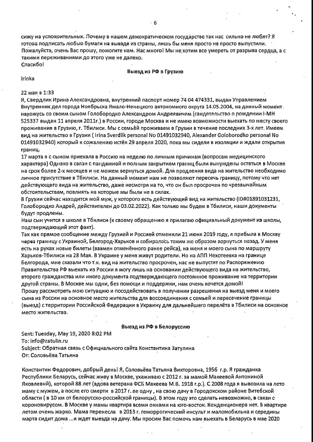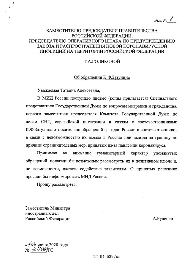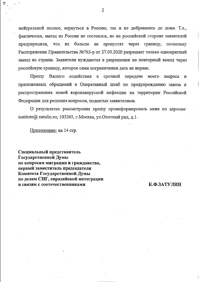 Мы сообщали, что на запросы Константина Затулина (от 13 и 29 мая 2020г.) по проблемам пересечения границ, возникших из-за пандемии, был получен ответ из МИДа России. В нем говорилорсь, что многие вопросы, поднятые в обращениях соотечественников, которые поступили к депутату, разрешены дополнениями, внесенными 6 июня в распоряжения Правительства РФ №635-р от 16.03.2020 и №763-р от 27.03.2020.