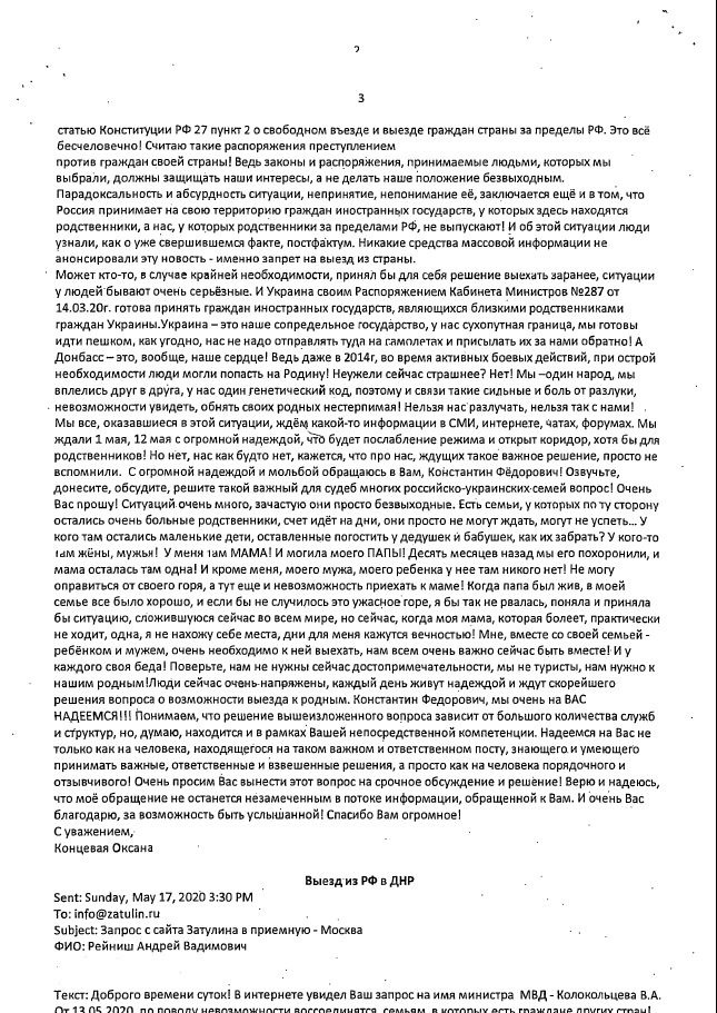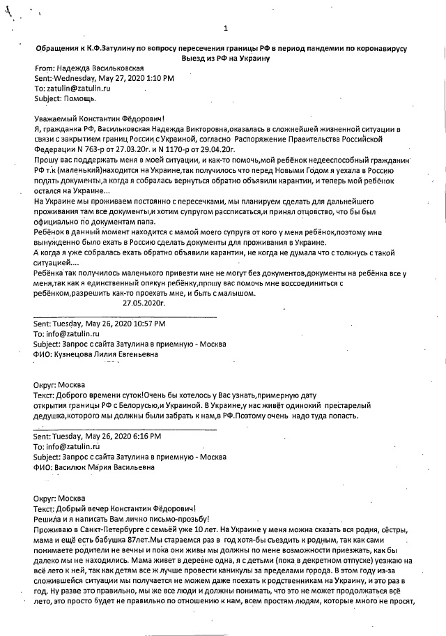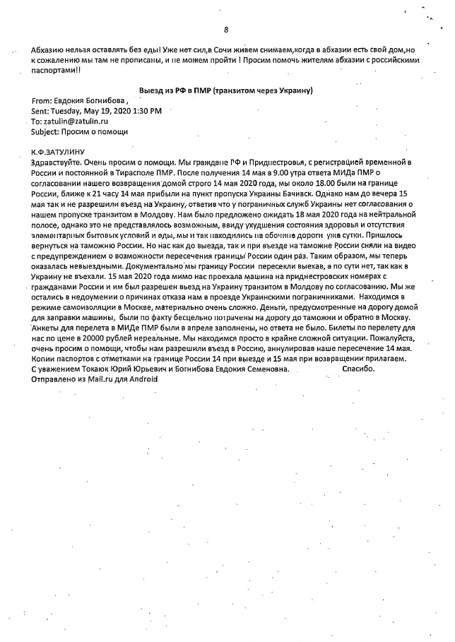 Но оставалась без решения одна, уникальная ситуация, в которой оказалась семья российских граждан, проживающих в Тирасполе, при выезде из России на машине через пункт пропуска Троебортное-Бачевск на российско-украинской границе. Из-за необъяснимого отказа украинских пограничников пропустить их через Украину для проезда в ПМР, они были вынуждены после ночевки на нейтральной полосе вернуться на российскую сторону. Фактически выезд из России домой не состоялся, но их предупредили, что больше не пропустят через российскую границу, т.к. пересечь ее можно только один раз. По Распоряжению Правительства №763-р в период ограничения движения через границу в связи с коронавирусной пандемией гражданам России, постоянно проживающим за рубежом, дано разрешение на однократный выезд. Разрешение на повторное пересечение границы сами пограничники дать не вправе. Когда откроют границу – не известно. А дома их ждет сын-инвалид, который уже почти три месяца совершенно в бедственном положении.