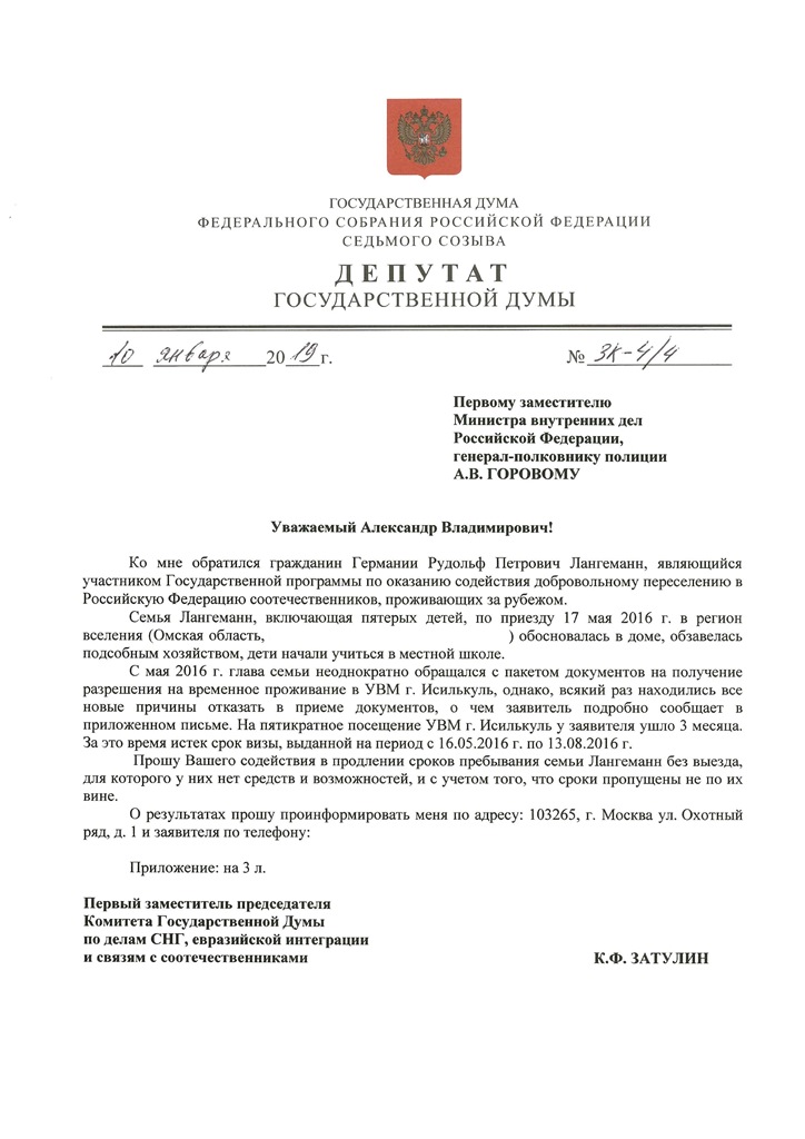 К депутату Государственной Думы Константину Затулину обратилась семья участников Программы переселения из Германии с просьбой о содействии в подаче документов на разрешение на временное проживание. В 2016 году супруги с пятью детьми приехали в Россию на постоянное место жительства. Из-за различных бюрократических проволочек длительное время они не могли подать документы на разрешение на временное проживание, что в итоге привело к окончанию срока их временного пребывания в России. Им грозила депортация.