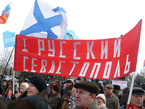 Участники митинга скандировали лозунги: «Севастополь-Крым-Россия!», «Россия, Украина, Беларусь – вместе мы Святая Русь!».