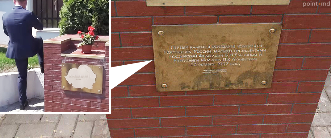 Постамент, на котором сохранился первый камень посольства России в Молдове, заложенный президентом России Борисом Ельциным, обклеили на акции унионистов.