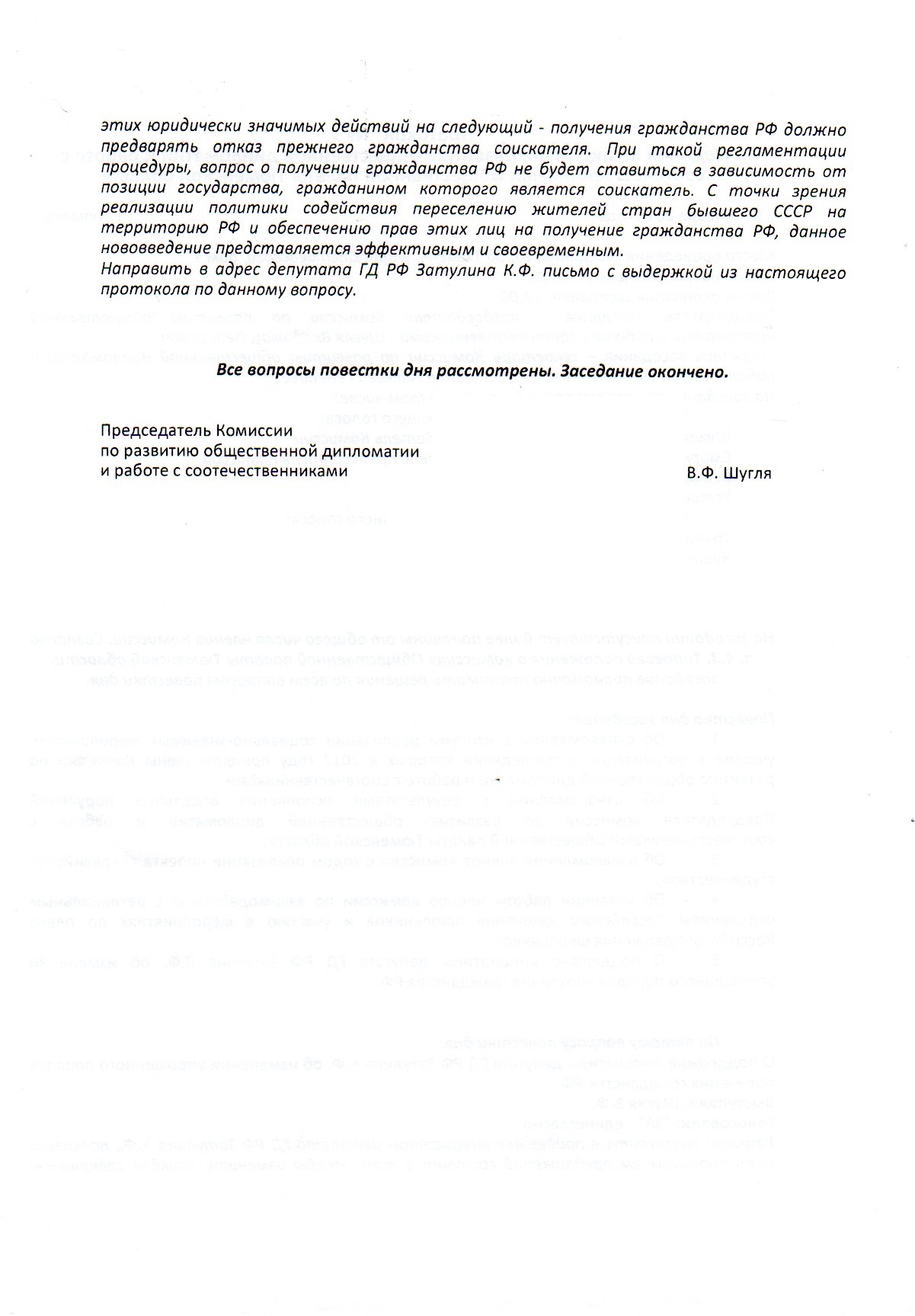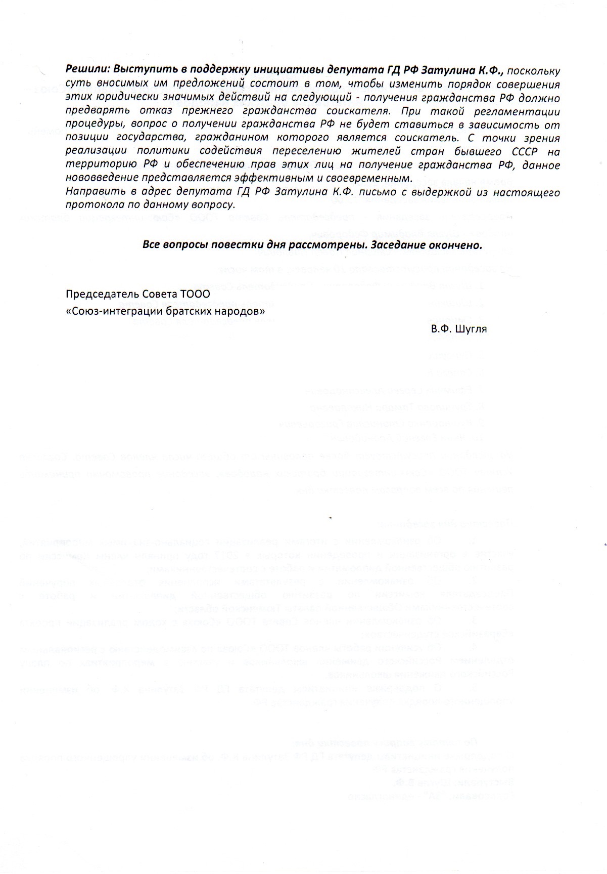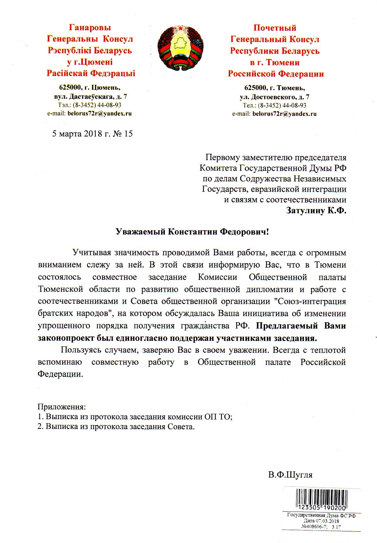 В адрес Константина Затулина поступило письмо от Почетного Генерального Консула Республики Беларусь в г. Тюмени, в котором сообщается, что Комиссия Общественной палаты Тюменской области по развитию общественной дипломатии и работе с соотечественниками и Совет общественной организации «Союз-интеграция братских народов» единогласно поддержали внесенный в Государственную Думу законопроект Константина Затулина об изменении упрощенного порядка получения российского гражданства соотечественниками-носителями русского языка.