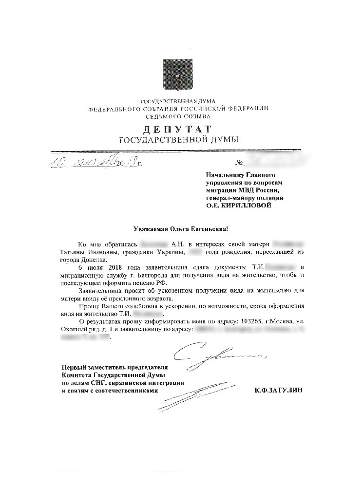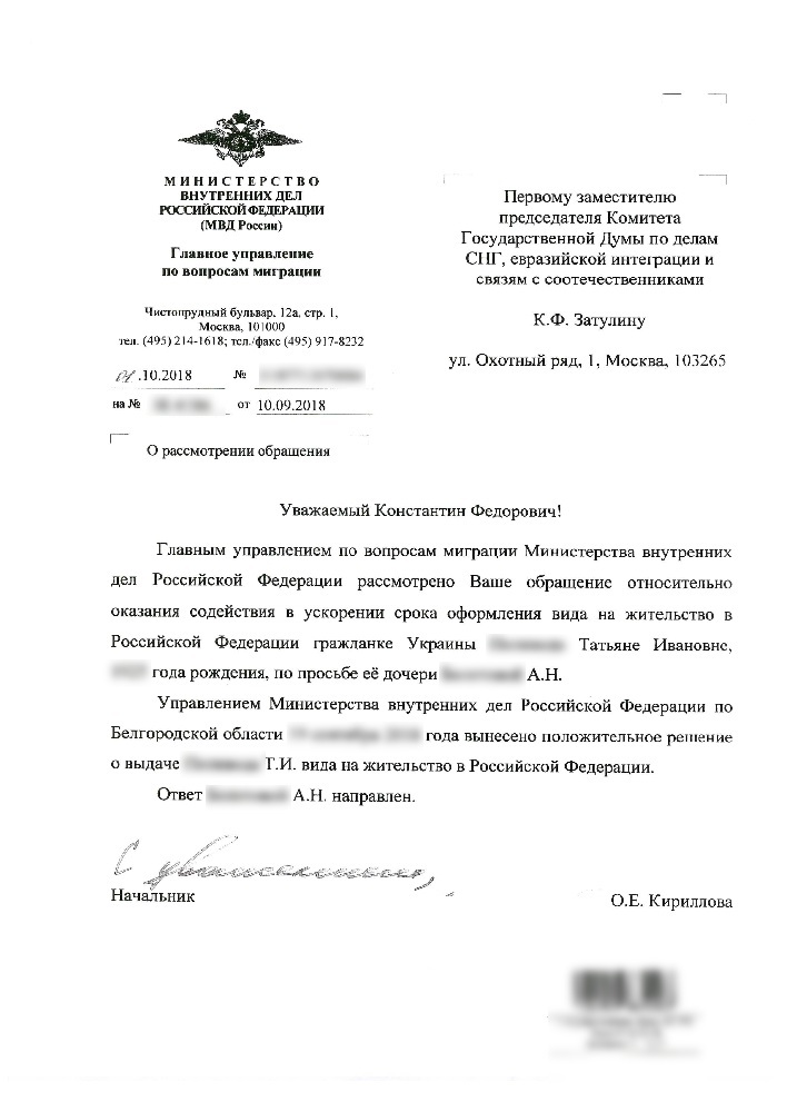 Константин Затулин обратился к начальнику ГУВМ МВД России Ольге Кирилловой с просьбой ускорить процесс выдачи вида на жительство для мамы заявительницы. От руководства миграционного ведомства пришел положительный ответ.