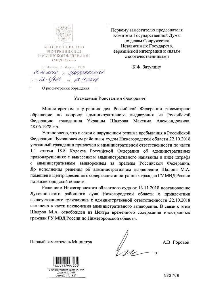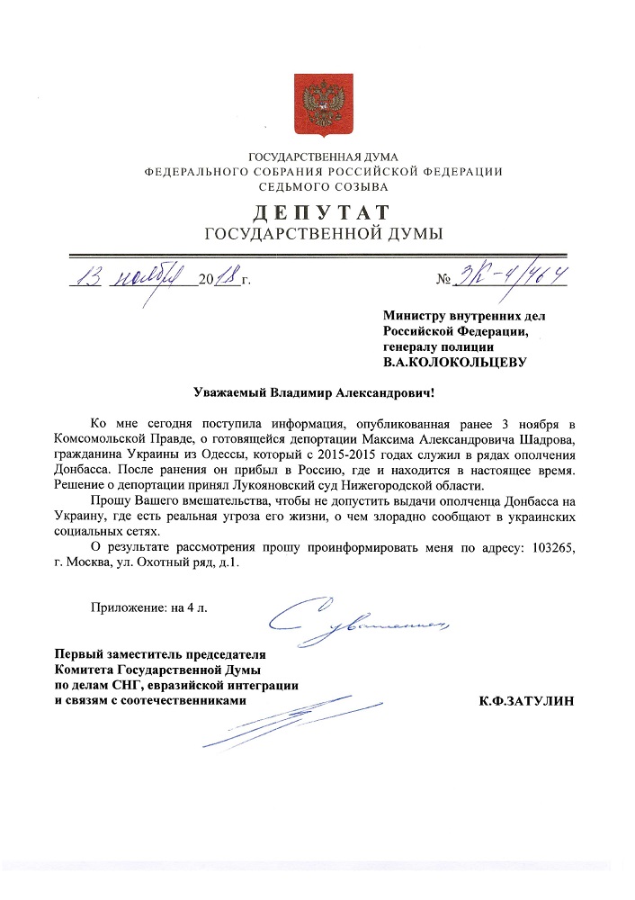 13 ноября Константин Затулин обратился к Министру внутренних дел Владимиру Колокольцеву по поводу депортации нарушившего правила пребывания в России гражданина Украины Максима Шадрова, участника ополчения ДНР. 4 декабря в ответном письме из Минстерства внутренних дел было сообщалось, что решение суда о выдворении было отменено.