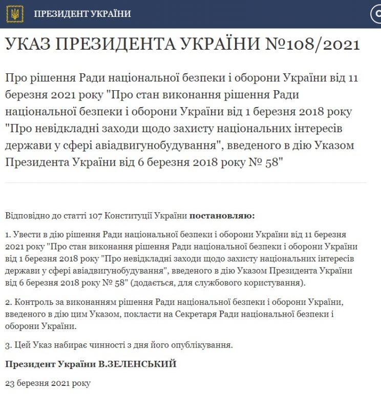«В соответствии со статьей 107 Конституции Украины постановляю: 1. Ввести в действие решение Совета национальной безопасности и обороны Украины от 11 марта 2021 «О состоянии выполнения решения Совета национальной безопасности и обороны Украины от 1 марта 2018» О неотложных мерах по защите национальных интересов государства в сфере авиационных двигателей «, введенного в действие Указом президента Украины от 6 марта 2018 № 58 «(прилагается, для служебного пользования)», — говорится в указе.